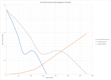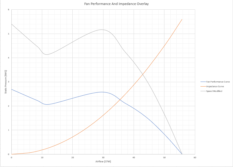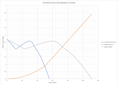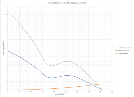Note that at intermediate flow points, the flow and pressure increases, and whether fans should be in series or parallel depends upon the degree of system resistance, i.e. placing two air movers in series in the low resistance system shown would produce a negligible increase in flow and pressure.