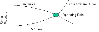 When a fan is used to move air through electronic equipment, the flow through the systems is determined by the intersection of the performance curve and the resistance curve. At this point of operation, the pressure available from the fan to force air through the system is equal to the pressure required by the system for that flow.